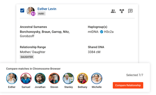 A FamilyTree DNA também identifica as correspondências do seu ADN materno e permite que entre em contacto com elas. Além disso, é possível combinar os três tipos de testes para obter uma análise mais completa da sua ascendência.