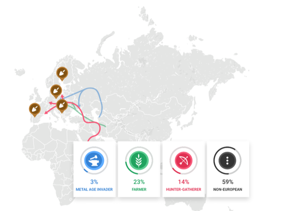O relatório apresentou-nos as percentagens da quantidade de ADN herdada de grupos europeus antigos, tais como: