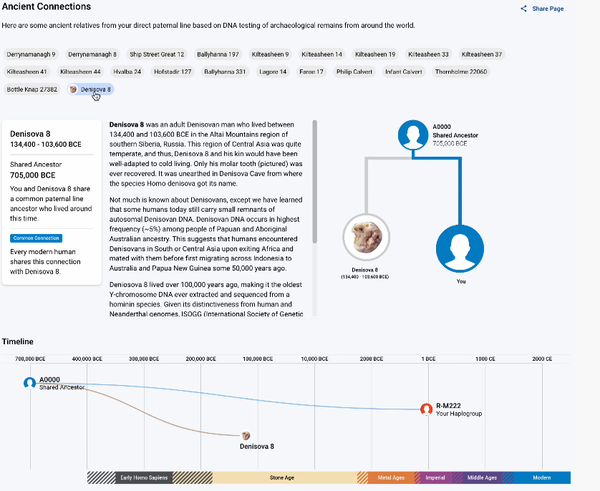 A FTDNA revela as suas ligações com figuras históricas e contemporâneas famosas. Também terá acesso a uma árvore genealógica gerada automaticamente que inclui todos os seus antepassados do lado materno.