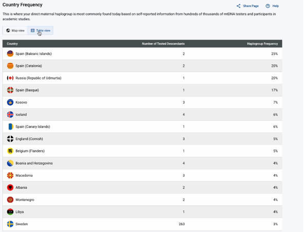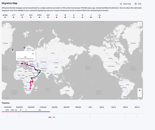 O relatório da análise do ADN mitocondrial apresenta a história dos seus antepassados maternos desde Eva num mapa interativo. Pode visualizar as rotas de migração dos seus antepassados, identificar quando as linhagens se separaram e localizar os países onde os seus descendentes residem atualmente.