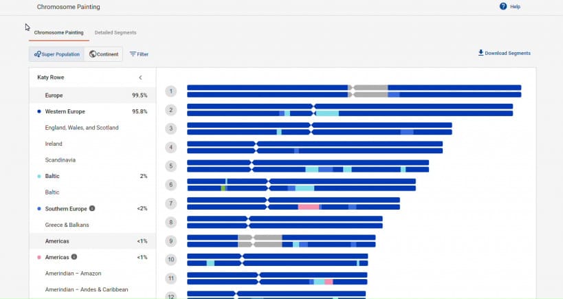 Mas essa não foi a única coisa que nos surpreendeu na FTDNA. O relatório usa códigos de cores para mostrar de onde vem cada segmento de ADN. Isso permitiu-nos descobrir locais adicionais que não tinham nenhuma ligação com as informações que temos atualmente sobre as nossas origens ancestrais.