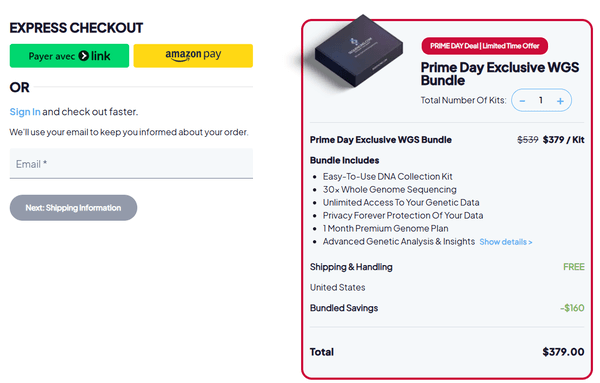 | Pacote WGS exclusivo para o Prime Day | 599 $ (aproximadamente 551 €) | Tempo de processamento de 6 a 8 semanas 1 mês de plano premium 10 relatórios de saúde |